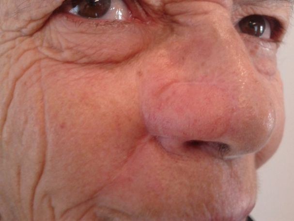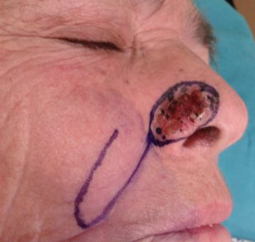 Ασθενής 70 ετών προσήλθε με ευμέγεθες επιθηλίωμα που καταλάμβανε σχεδόν όλο το δεξή πτερύγιο της ρινός. Υπεβλήθη σε όλον τον απαραίτητο κλινικοεργαστηριακό έλεγχο και εν συνεχεία, υπό τοπική αναισθησία, σε εκτομή του καρκινώματος επί υγιών ορίων και κάλυψη του ελλείμματος με τοπικό, ρινοπαρειακό κρημνό.