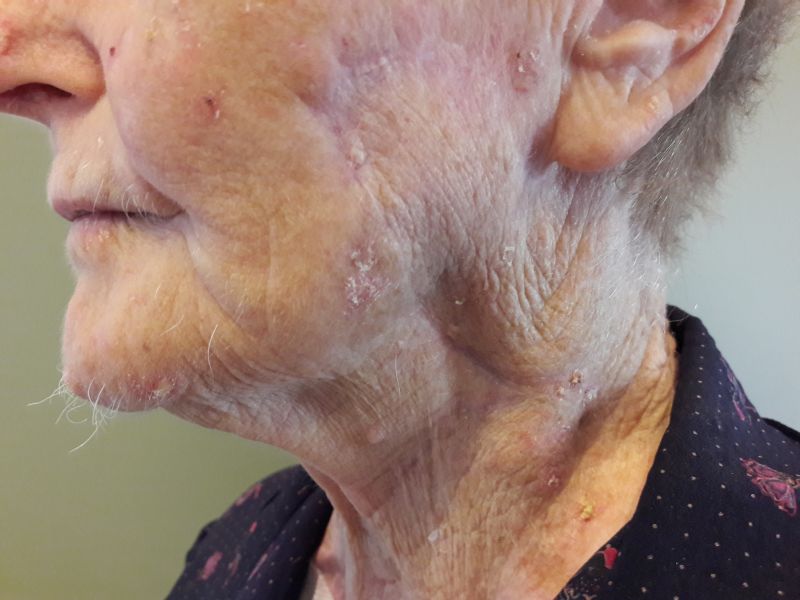Νεφροπαθής ασθενής 85 ετών προσήλθε με δυο ευμεγέθη επιθηλίωματα αριστερής παρειάς (μάγουλου). Υπεβλήθη σε όλον τον απαραίτητο κλινικοεργαστηριακό έλεγχο και εν συνεχεία, υπό τοπική αναισθησία, σε εκτομή του καρκινώματος επί υγιών ορίων και κάλυψη του ελλείμματος με μεταθετό κρημνό από την πλάγια επιφάνεια του αυχένα.