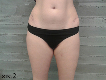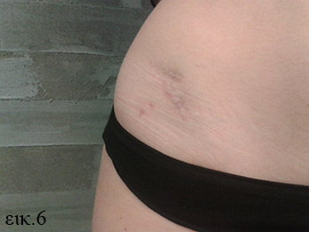 35χρονη ασθενής προσέρχεται στο ιατρείο μας δυο χρόνια μετά από τροχαίο ατύχημα στο οποίο υπέστη πολλαπλά κατάγματα λεκάνης και κάτω άκρων για τα οποία νοσηλεύθηκε σε δημόσιο νοσοκομείο για έναν περίπου μήνα. Η εξωτερική οστεοσύνθεση λεκάνης είχε ως αποτέλεσμα δυο ευμεγέθεις μόνιμες ουλές στα λαγόνια (εικ.3 και 5), ενώ για άγνωστο λόγο έφερε έπαρμα κάτωθεν του σημείου προσπέλασης των ορθοπαιδικών στον αριστερό μηρό (εικ.1 και 3).